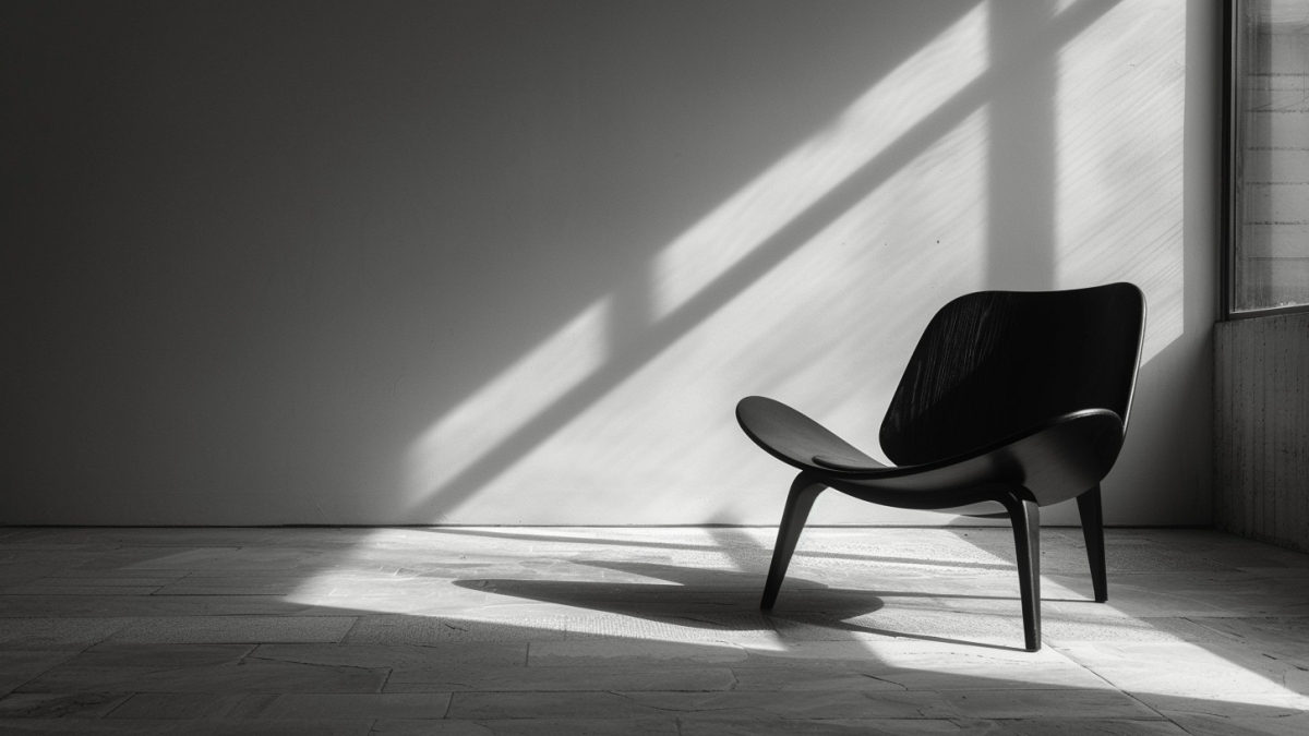 A stylish modern chair is positioned centrally in a room bathed in natural light. The sharp contrasts created by the streaming sunlight through a nearby window highlight the chair’s sleek, curved design. The rays cast long shadows across the smooth surface of the wooden floor, enhancing the minimalist aesthetic of the space. The stark simplicity of the image draws attention to the interplay between light, shadow, and the solitary piece of furniture, evoking a sense of tranquility and contemplative silence.